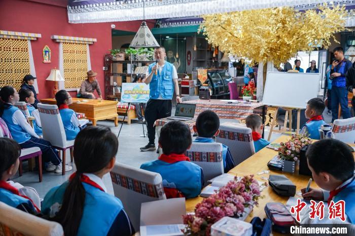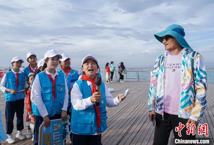 图为小学生在青海湖二郎剑景区内向游客科普青海湖相关知识。马铭言摄