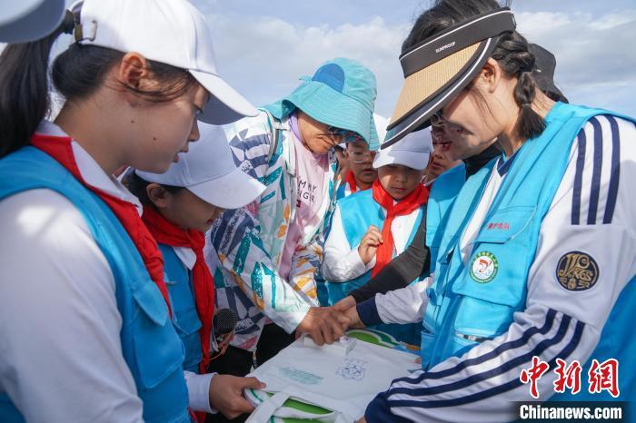 图为在青海湖二郎剑景区内,小学生与游客互动,为游客赠送自制的关于青海湖裸鲤的文创礼物。马铭言摄