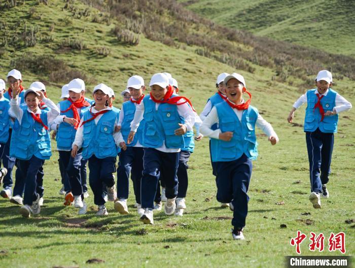 图为小学生在青海湖畔快乐奔跑,亲近大自然。马铭言摄