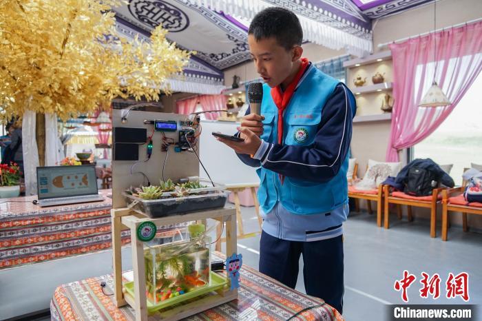 图为小学生介绍自己的科创作品“鱼草共生微景观”。马铭言摄
