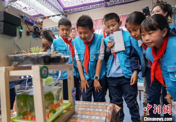 图为小学生观察同学的科创作品“鱼草共生微景观”。马铭言摄