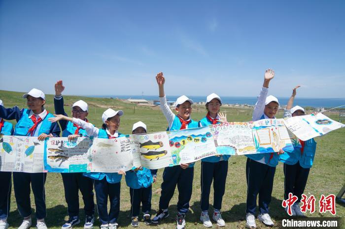 图为小学生在青海湖畔展示现场绘制的关于保护青海湖裸鲤的手抄报。马铭言摄