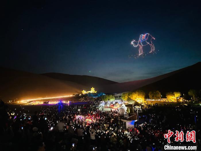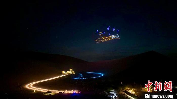 6月15日晚,敦煌鸣沙山,万人星空大漠演唱会启幕。图为无人机秀在月牙泉上空形成骆驼图案。 九美旦增 摄
