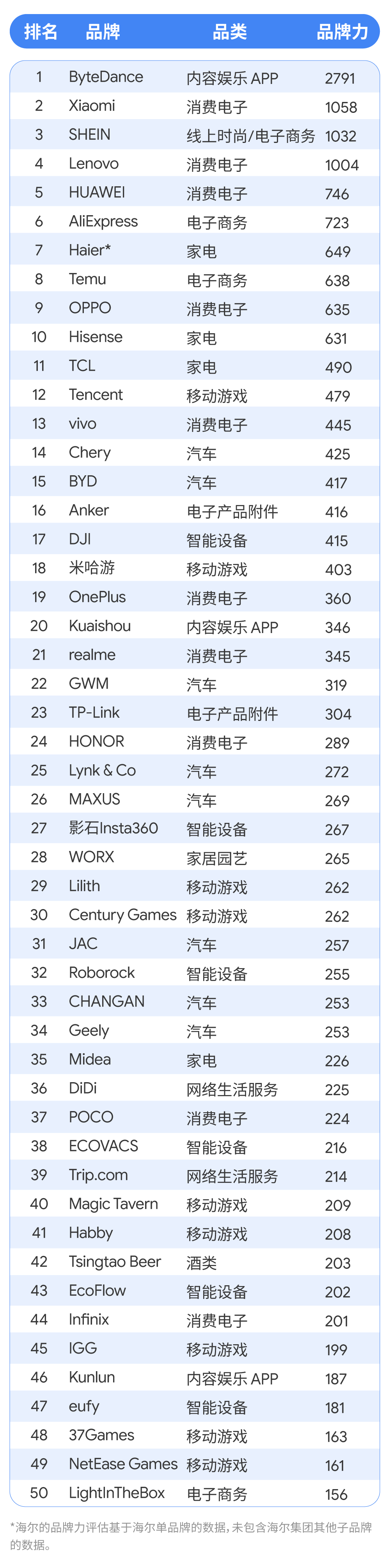 2024年6月20日,Google谷歌与全球知名咨询机构凯度联合发布了《Google x Kantar BrandZ 中国全球化品牌 2024》榜单,揭晓了今年中国全球化品牌50强及成长明星榜,展示了中国品牌在国际市场的最新发展态势。