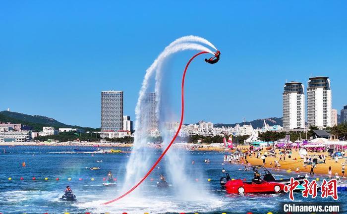 6月26日,山东威海,游客体验“水上飞人”项目。张蕃 摄