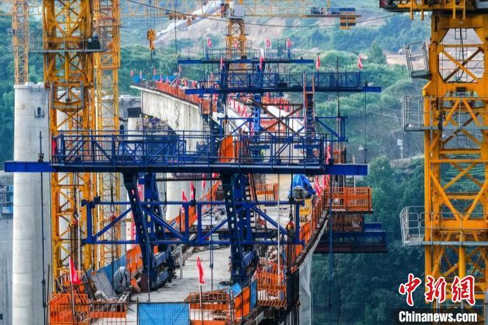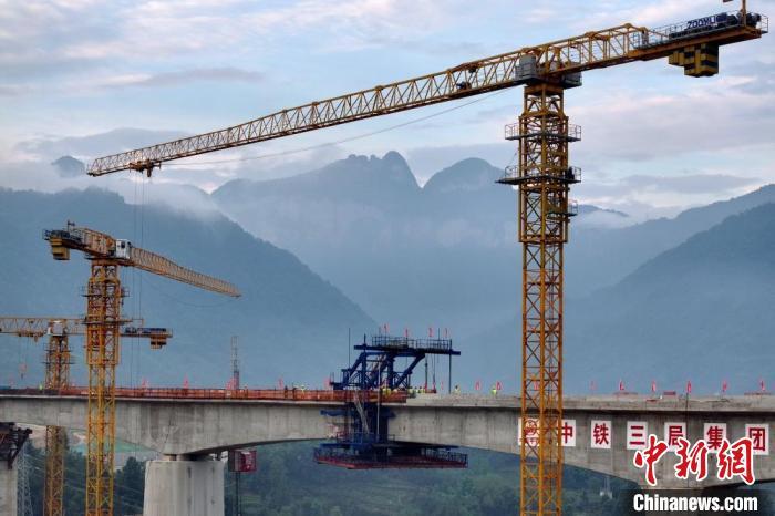 中新网宜昌7月9日电 (记者 郭晓莹)据中铁三局9日消息,当日6时10分,随着最后一方混凝土顺利浇筑,三峡枢纽茅坪港疏港铁路九里村特大桥连续梁中跨顺利合龙,标志着三峡疏港铁路项目建设取得了又一新的进展。