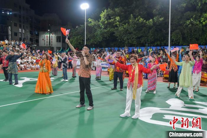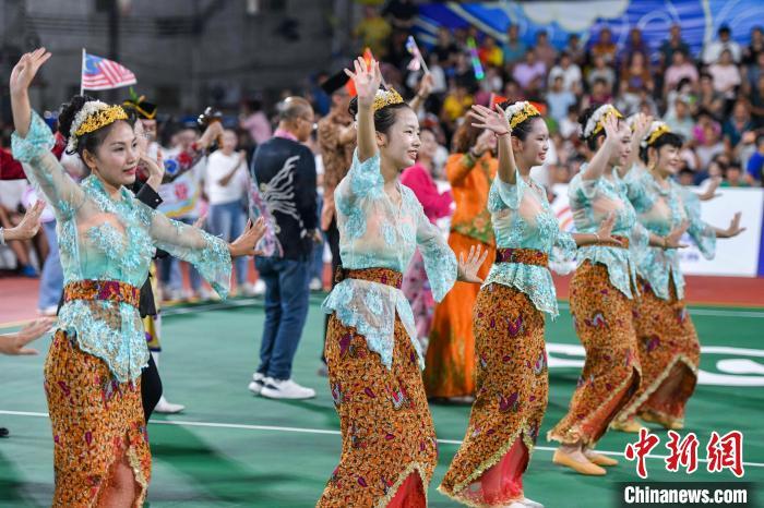 7月13日晚,海南文昌,2024年“九九杯”海南(文昌)乡镇排球联赛铺前站迎来一场中马排球友谊赛,由文昌火箭队对阵马来西亚华侨排球队。比赛前,由马来西亚海南会馆联合会牵头组织的马来西亚风情歌舞表演吸引现场观众。图为马来西亚风情歌舞表演。中新社记者 骆云飞 摄