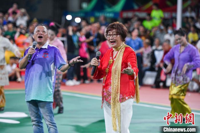 7月13日晚,海南文昌,2024年“九九杯”海南(文昌)乡镇排球联赛铺前站迎来一场中马排球友谊赛,由文昌火箭队对阵马来西亚华侨排球队。比赛前,由马来西亚海南会馆联合会牵头组织的马来西亚风情歌舞表演吸引现场观众。图为马来西亚海南总商会总会长、拿督林秋雅(右)演唱歌曲《乡音代代传》。中新社记者 骆云飞 摄