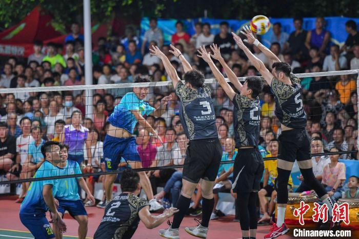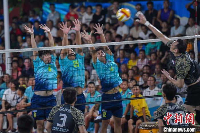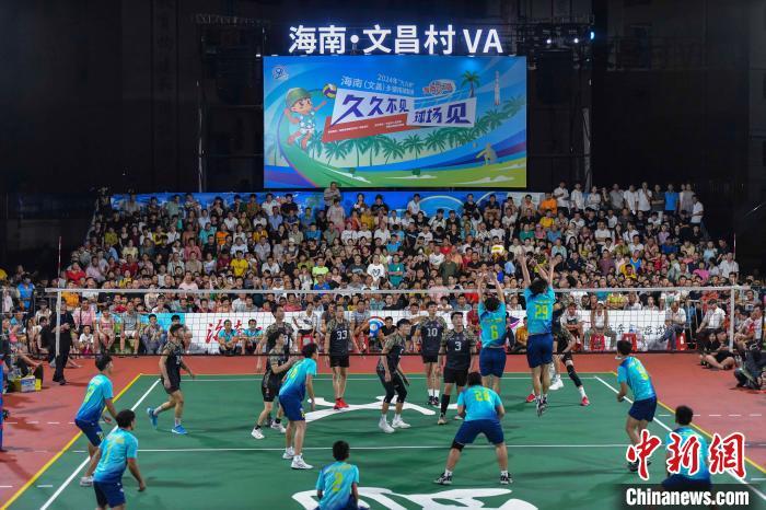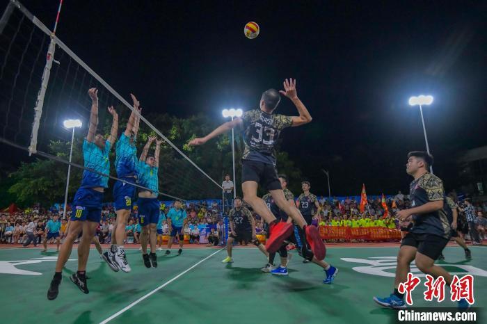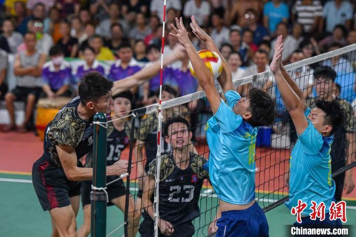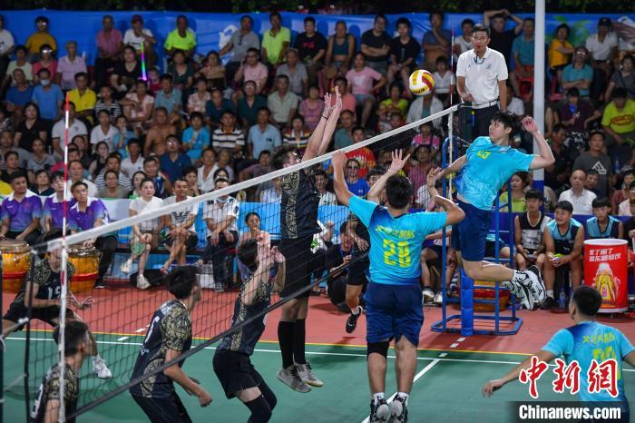 7月13日晚,海南文昌,2024年“九九杯”海南(文昌)乡镇排球联赛铺前站迎来一场中马排球友谊赛,由文昌火箭队(蓝)对阵马来西亚华侨排球队(黑)。经过激烈角逐,最终文昌火箭队3:1战胜马来西亚华侨排球队,为现场观众送上一场“南洋风”排球友谊赛。图为比赛现场。中新社记者 骆云飞 摄