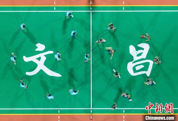 7月13日晚,海南文昌,2024年“九九杯”海南(文昌)乡镇排球联赛铺前站迎来一场中马排球友谊赛,由文昌火箭队(蓝)对阵马来西亚华侨排球队(黑)。经过激烈角逐,最终文昌火箭队3:1战胜马来西亚华侨排球队,为现场观众送上一场“南洋风”排球友谊赛。(无人机照片)中新社记者 骆云飞 摄