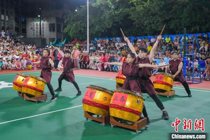 7月13日晚,海南文昌,2024年“九九杯”海南(文昌)乡镇排球联赛铺前站迎来一场中马排球友谊赛,由文昌火箭队对阵马来西亚华侨排球队。比赛前,由马来西亚海南会馆联合会牵头组织的马来西亚风情歌舞表演吸引现场观众。图为来自马来西亚的艺人表演二十四节令鼓《心奏》。中新社记者 骆云飞 摄