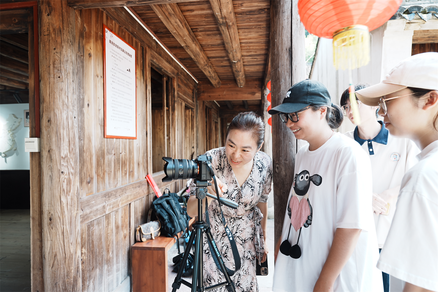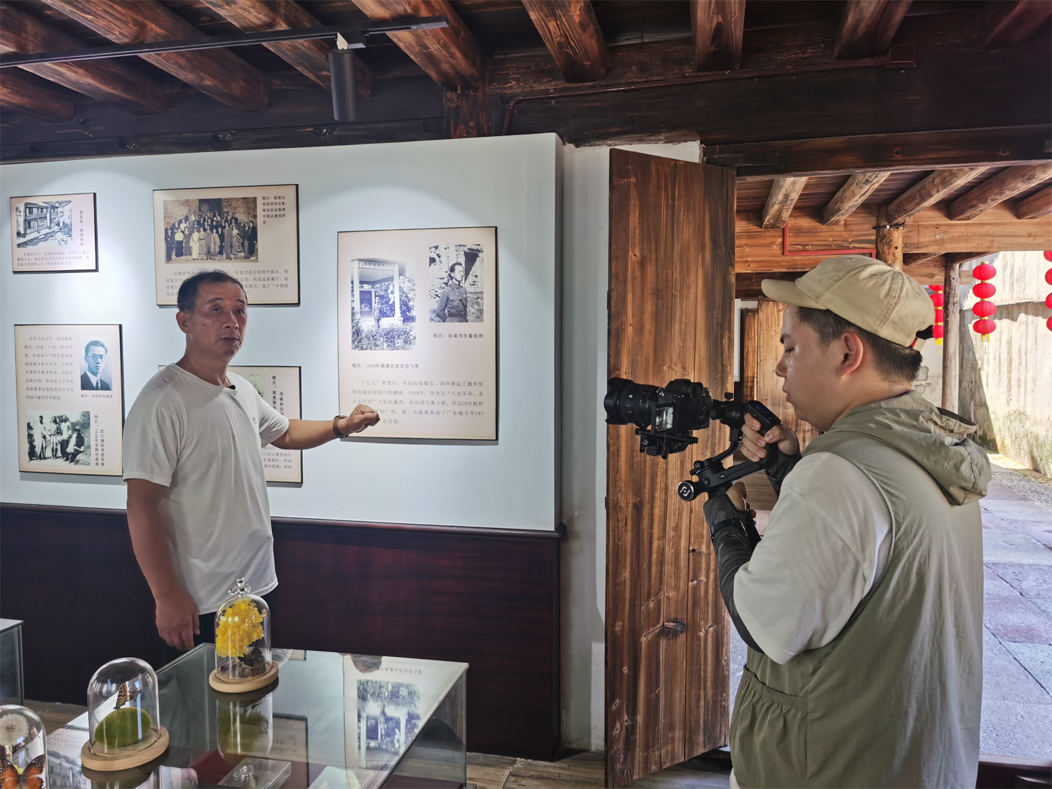 走过山间小路,实践队来到周尧故居,按照先前的分工,他们在各自的岗位上行动起来,有的拍摄空镜、有的拍摄展板、有的飞起了航拍……