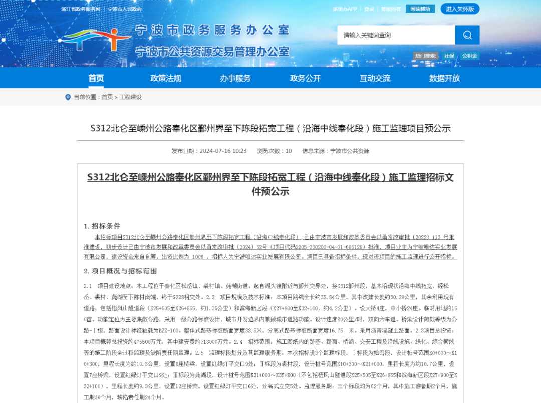 7月16日,宁波市公共资源交易电子服务系统预公示了S312北仑至嵊州公路奉化区鄞州界至下陈段拓宽工程(沿海中线奉化段)施工监理招标文件。这意味着,这条奉化东南片区连接宁波中心城区的滨海快速通道,距离开工建设又近了一步。