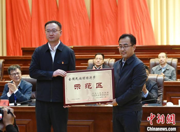 图为青海省民宗委向玉树州颁授“全国民族团结进步示范区”牌匾。马铭言摄