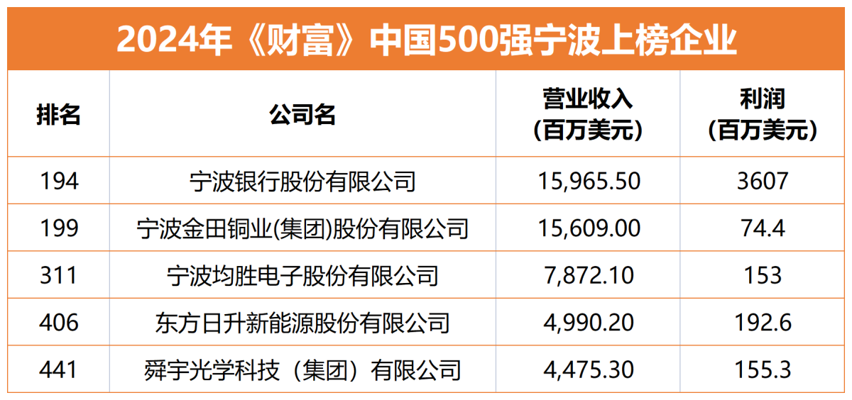 宁波共有5家企业上榜,上榜企业均为上市公司,分别是宁波银行(第194位)、金田股份(第199位)、均胜电子(第311位)、东方日升(第406位)、舜宇光学(第441位)。