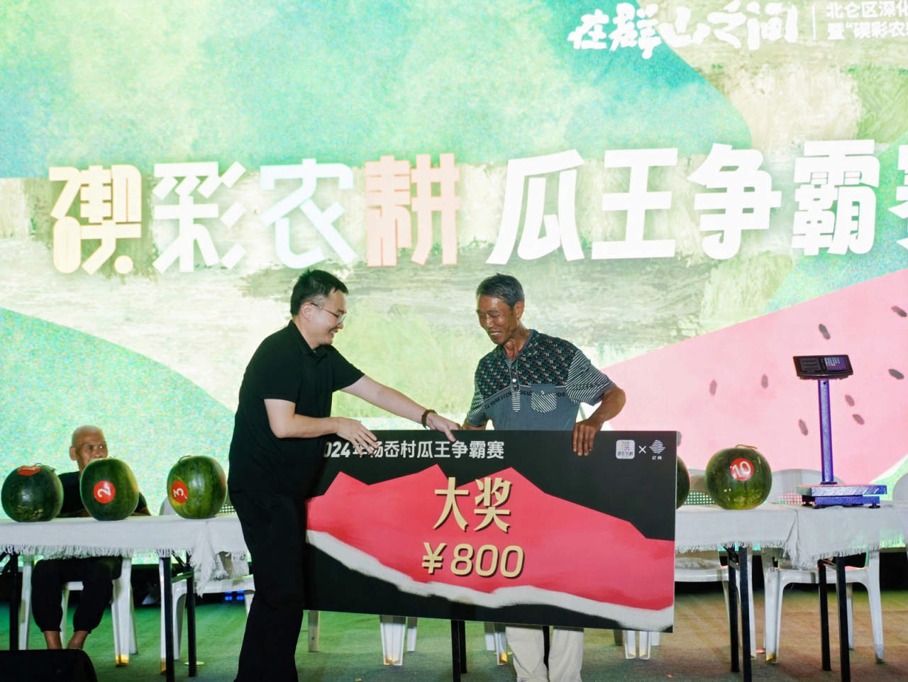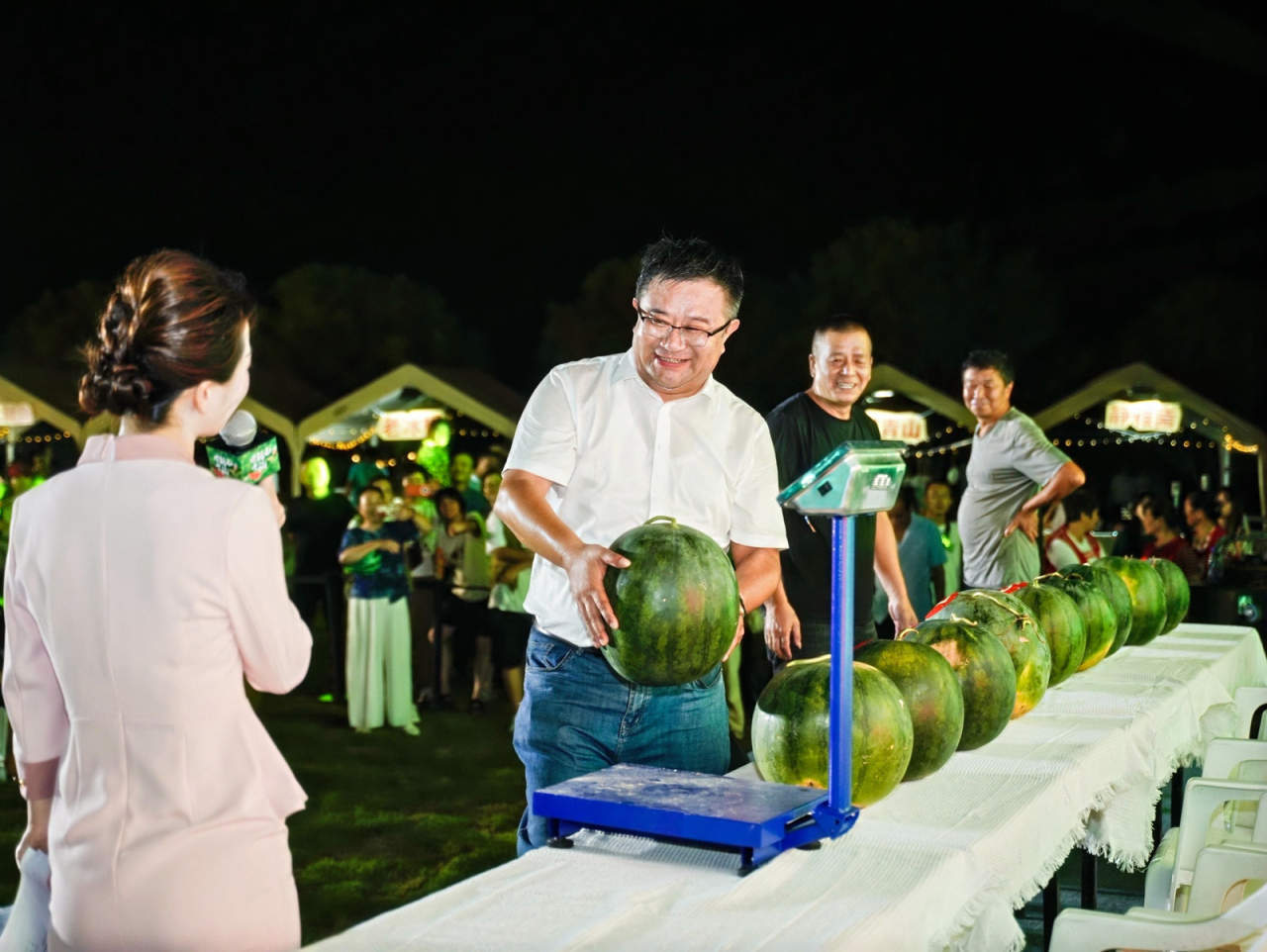 10位村民携带着自己精心培育的西瓜上台比拼,经过激烈角逐,一枚重约13.8千克的重量级“瓜王”脱颖而出,紧接着举行的选瓜大赛与蒙眼吃瓜大赛更是将现场氛围推向了高潮,欢声笑语此起彼伏,从四面八方赶来参加的市民让这座村庄在夜晚也“活”了起来。