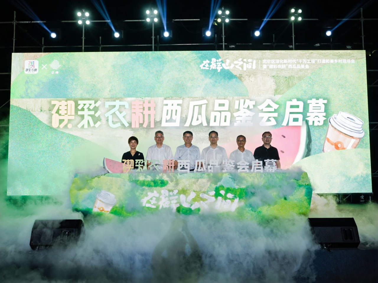 8月6日晚上的大碶街道杨岙村格外热闹,北仑区深化新时代“千万工程” 打造和美乡村现场会暨“碶彩农耕”西瓜品鉴会在这里举行。