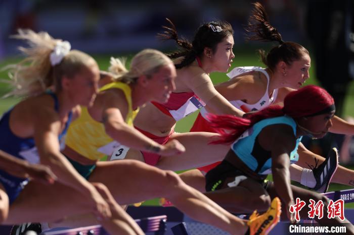 当地时间8月8日,巴黎奥运会女子100米栏复活赛在法兰西体育场举行,中国选手吴艳妮(左三)以12秒98的成绩位列小组第4,无缘半决赛。 中新社记者 富田 摄