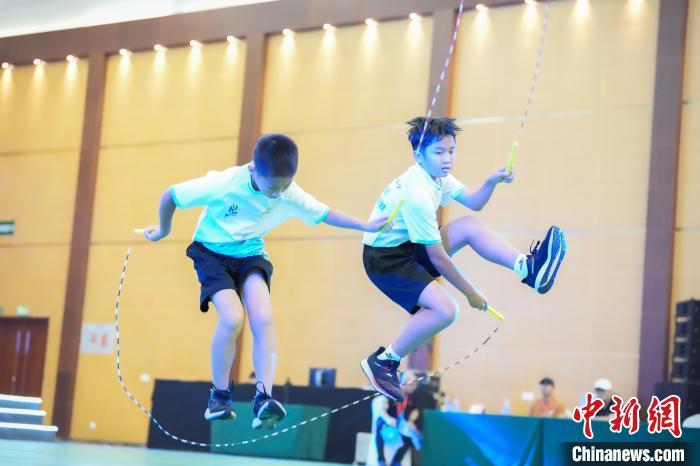 中新社福州8月13日电 (记者 闫旭)个人绳、车轮跳、交互绳……第十二届海峡青年节·首届海峡两岸(福州)青少年跳绳锦标赛13日在福州海峡青年交流营地开赛。