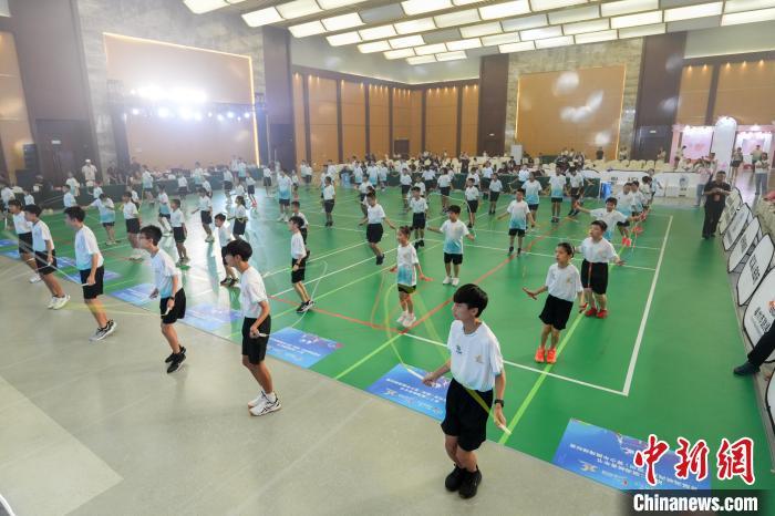 8月13日,首届海峡两岸(福州)青少年跳绳锦标赛开赛,选手正在进行赛前热身百人跳。 包华 摄