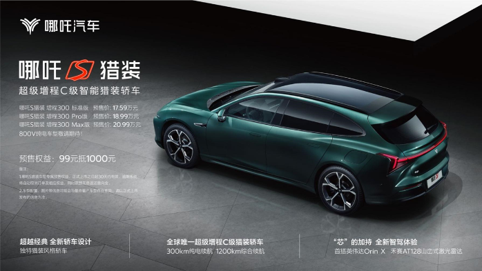 8月13日,哪吒S猎装版正式预售,定价17.59万元起。三款分别为:17.59万元的增程300标准版、18.99万元的增程300Pro版和预售价20.99万元的增程300 Max版。