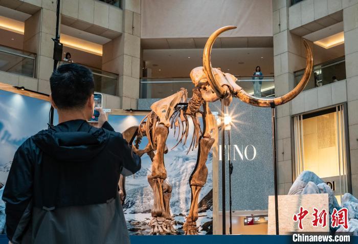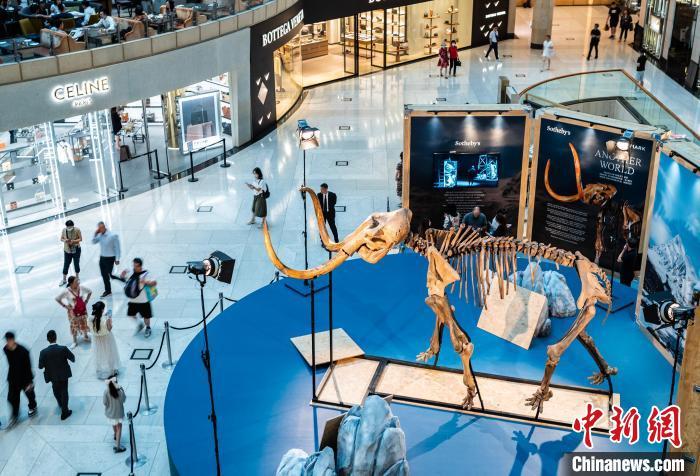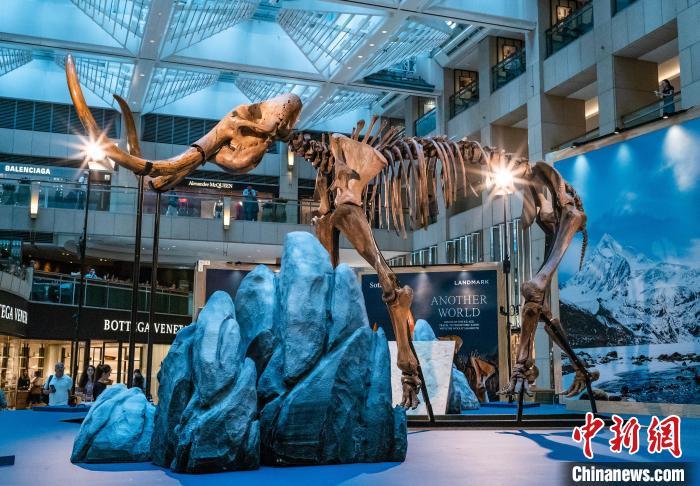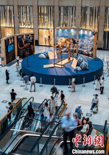 8月16日,香港中环一座写字楼中庭展示一尊距今约1.2万年、高约3.5米的猛犸化石。据悉,这尊猛犸化石是香港苏富比拍卖行推出的“冰河巨兽:与猛犸象一起踏上史前地球之旅”展览的展品,自8月15日至8月29日向公众展示。中新网记者 侯宇 摄