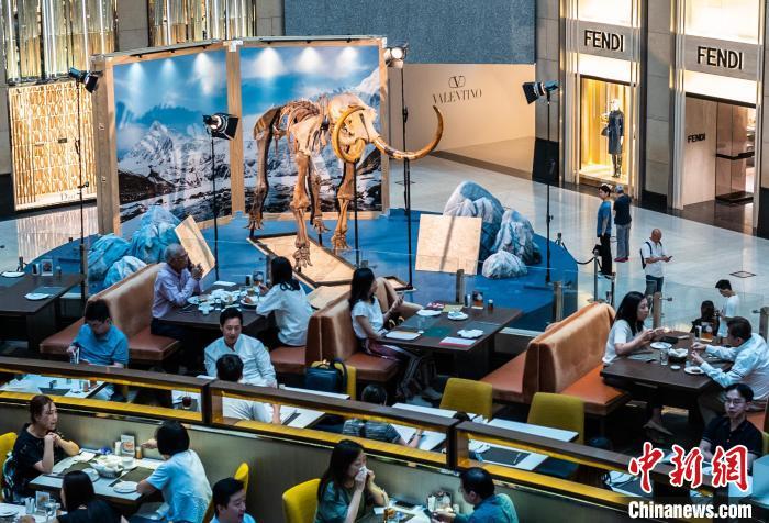 图为人流熙攘的写字楼中庭展示猛犸化石。中新网记者 侯宇 摄