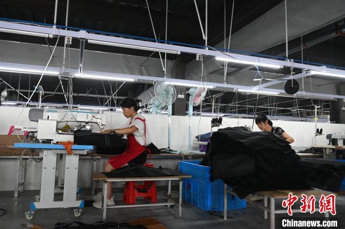 红亮乡村振兴产业园内箱包生产线上工人正在工作。 中新网记者 韩苏原 摄