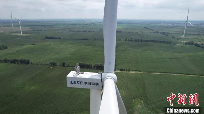 8月19日,内蒙古通辽市科尔沁区,工作人员在110米高的风力发电机上巡检设备。据悉,2023年,内蒙古自治区风力并网发电设备装机容量6961.1万千瓦,同比增加2392.76万千瓦,增长52.38%。风电新增容量占全国并网风电新增容量的31.64%,位居全国第一。如今,风力发电机已经成为内蒙古草原上一道亮丽的风景线,与蓝天白云相映成趣。(无人机图片)中新社记者 刘文华 摄