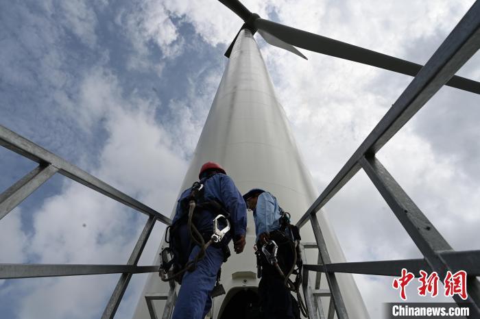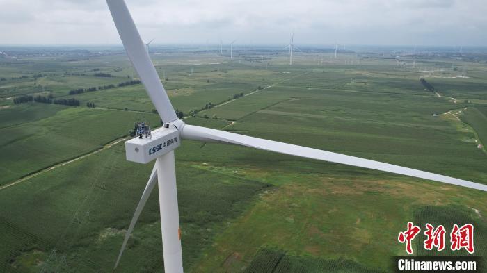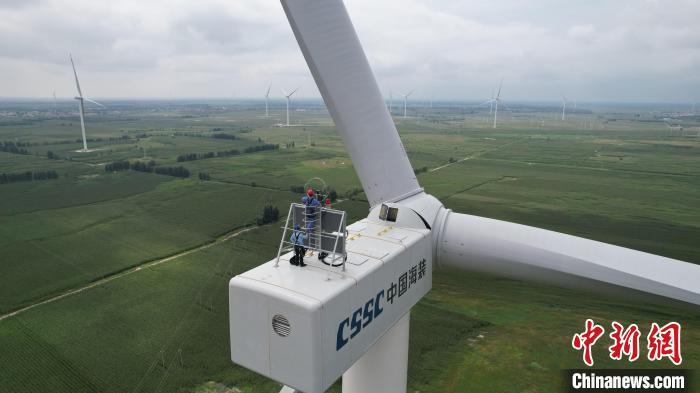 8月19日,内蒙古通辽市科尔沁区,工作人员准备登上110米高的风力发电机上巡检设备。据悉,2023年,内蒙古自治区风力并网发电设备装机容量6961.1万千瓦,同比增加2392.76万千瓦,增长52.38%。风电新增容量占全国并网风电新增容量的31.64%,位居全国第一。如今,风力发电机已经成为内蒙古草原上一道亮丽的风景线,与蓝天白云相映成趣。中新社记者 刘文华 摄