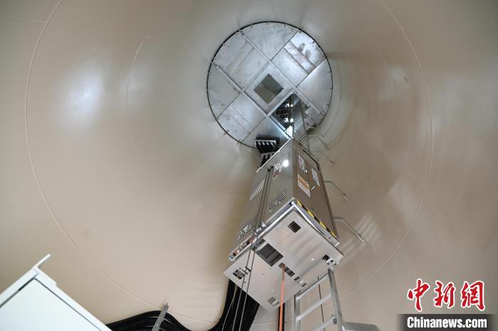8月19日,内蒙古通辽市科尔沁区,工作人员在风力发电机内,乘坐电梯上升。据悉,2023年,内蒙古自治区风力并网发电设备装机容量6961.1万千瓦,同比增加2392.76万千瓦,增长52.38%。风电新增容量占全国并网风电新增容量的31.64%,位居全国第一。如今,风力发电机已经成为内蒙古草原上一道亮丽的风景线,与蓝天白云相映成趣。中新社记者 刘文华 摄
