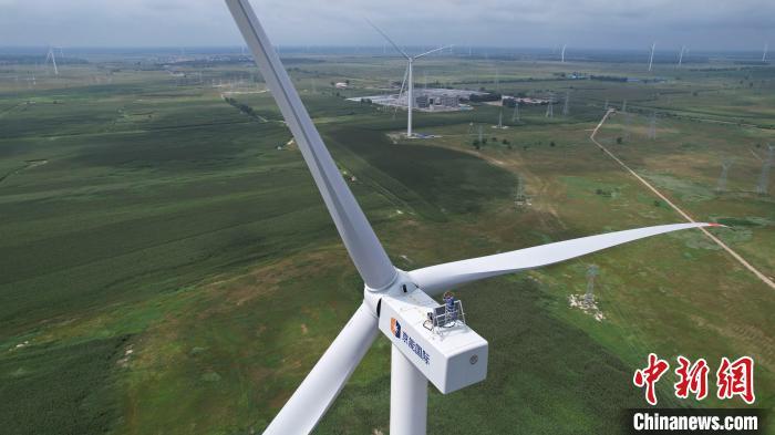 8月19日,内蒙古通辽市科尔沁区,多台风力发电机分布在变电站周围。据悉,2023年,内蒙古自治区风力并网发电设备装机容量6961.1万千瓦,同比增加2392.76万千瓦,增长52.38%。风电新增容量占全国并网风电新增容量的31.64%,位居全国第一。如今,风力发电机已经成为内蒙古草原上一道亮丽的风景线,与蓝天白云相映成趣。(无人机图片)中新社记者 刘文华 摄
