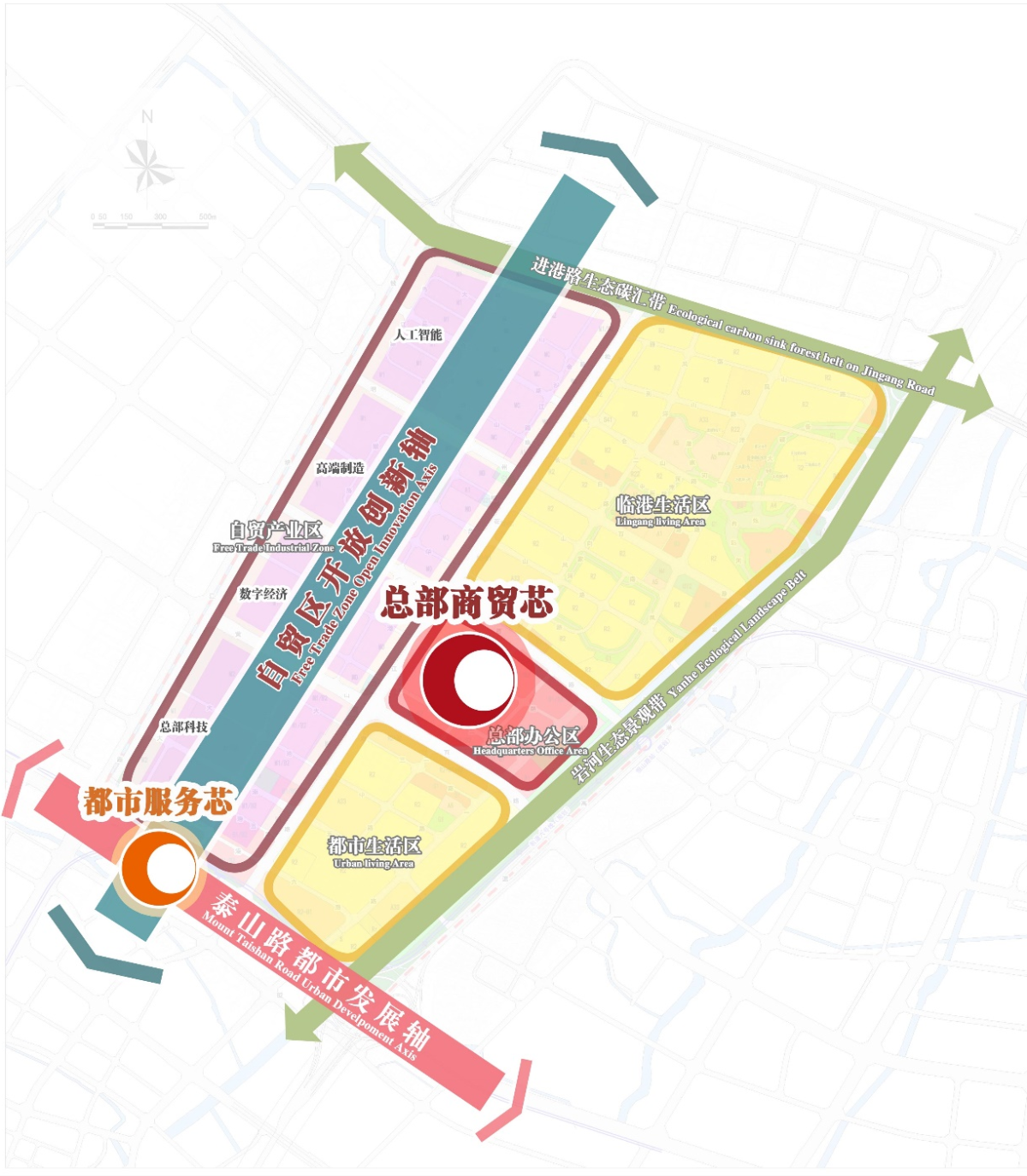 四区:规划区东北部分形成临港生活区、规划区东南部分形成都市生活区、规划区中部分形成总部办公区、规划区西侧部分形成自贸产业区。