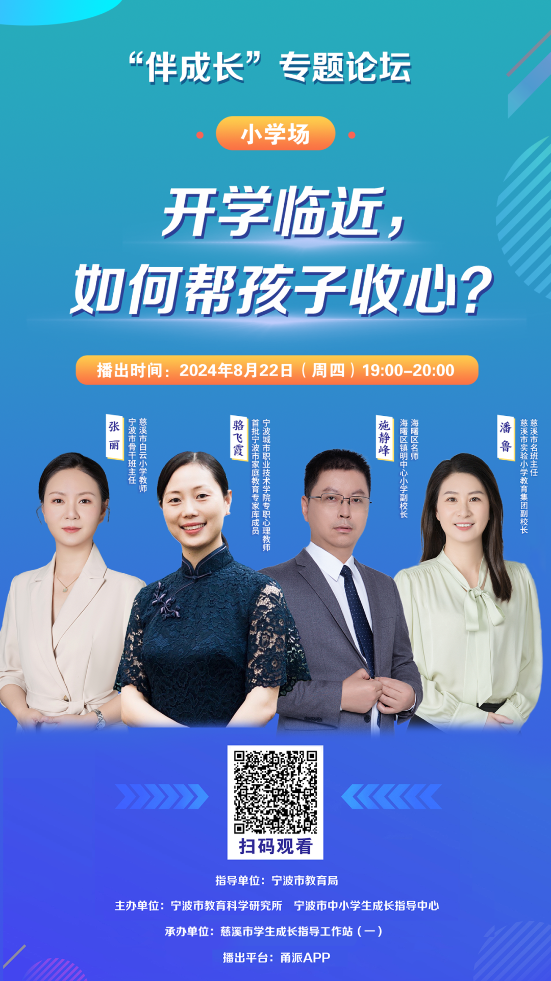 8月22日(周四)19:00-20:00,三位宁波教育领域的专家,将共同为家长和孩子们展开一场开学适应的智慧分享。