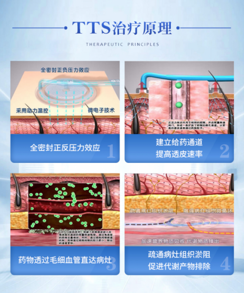 TTS动力温控经皮给药技术,是中医外治法基础上的一项重大创新。该技术通过皮肤表面给药,利用动力温控系统,使药物透过皮肤各层,进入体循环而产生治疗作用。与传统的口服药物和注射给药相比,TTS技术具有副作用少、见效快、剂量精准、便于使用等优点,特别适合老年人和慢性病患者。