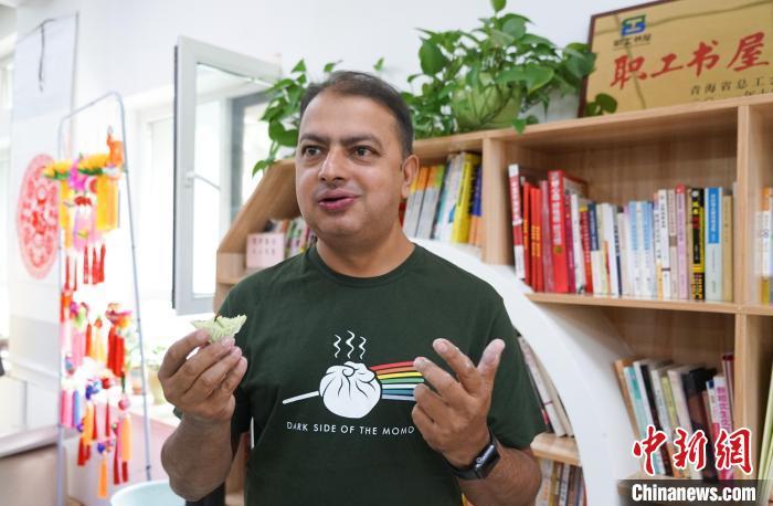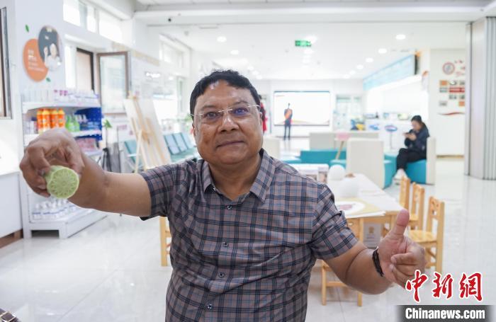 图为尼泊尔-中国媒体论坛主席、世界新闻理事会协会秘书长克瑟尔·什雷斯塔点赞制作的月饼。中新社记者 马铭言 摄