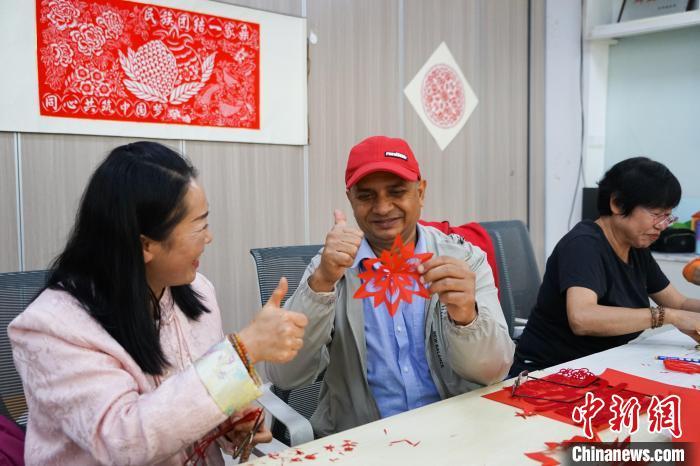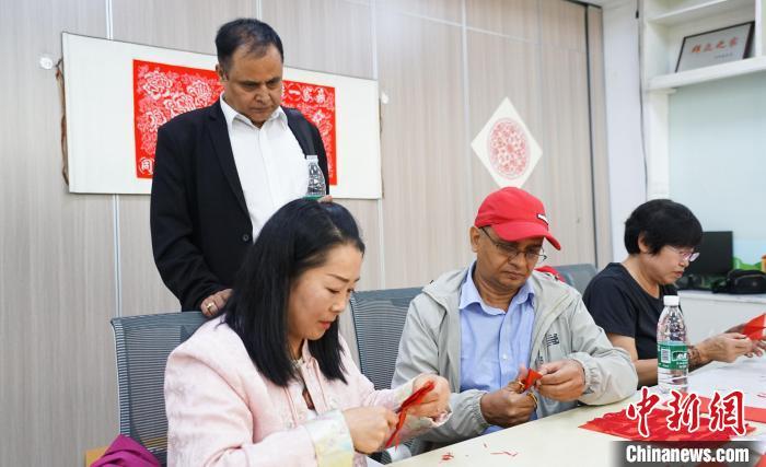 图为尼泊尔媒体考察团成员(右二)体验剪纸。中新社记者 马铭言 摄