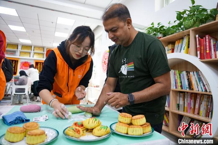 图为尼泊尔媒体考察团成员体验制作月饼。中新社记者 马铭言 摄