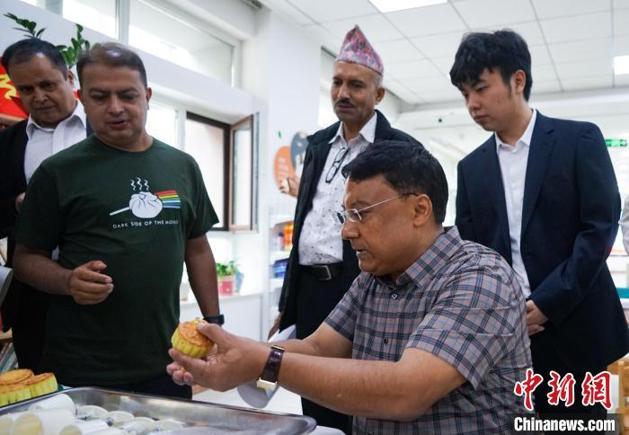 图为尼泊尔媒体考察团成员品尝月饼。中新社记者 马铭言 摄