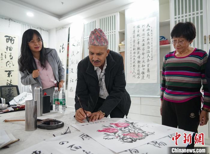 图为尼泊尔媒体考察团成员体验用毛笔在中国画上落款。中新社记者 马铭言 摄
