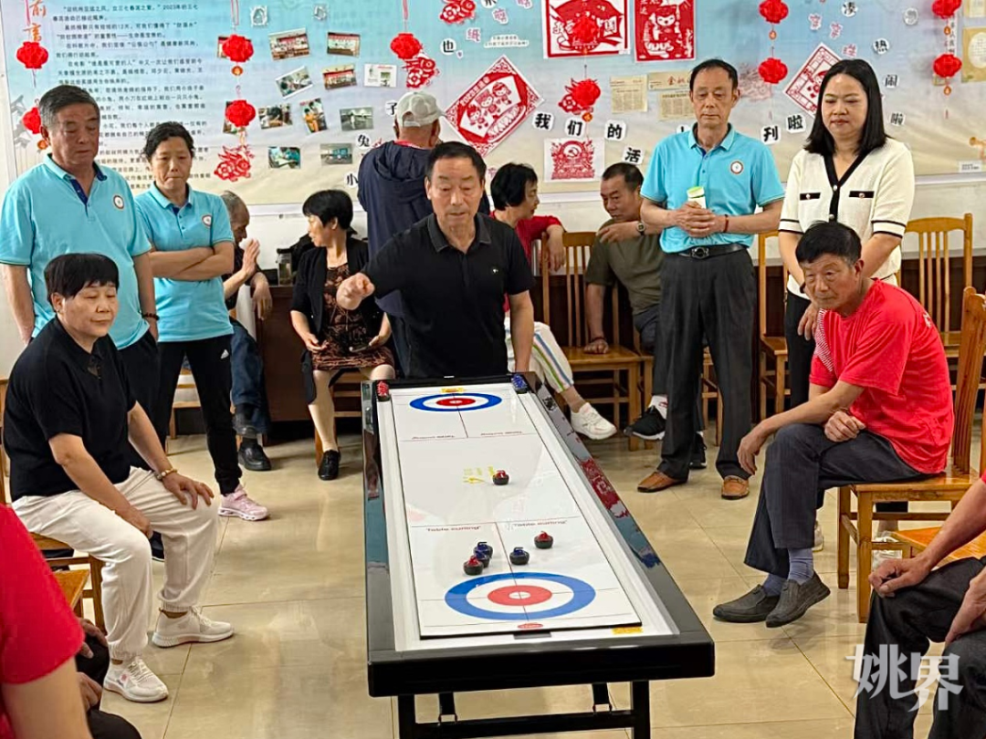 老年人在玩桌上冰球。