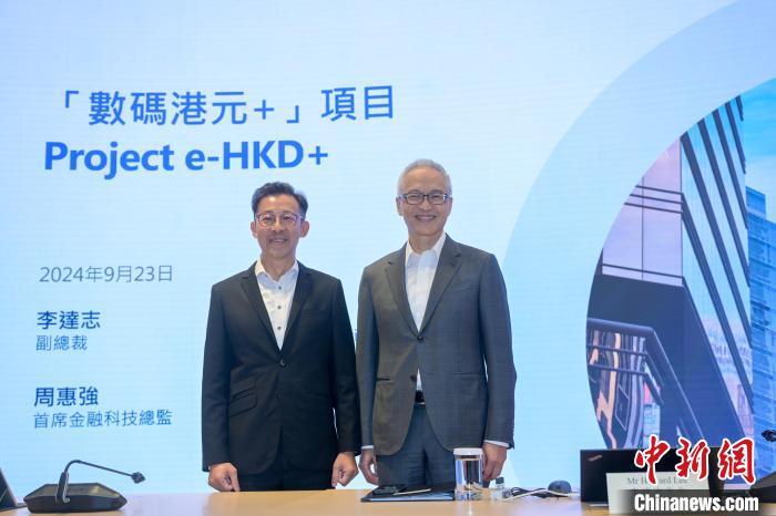 9月23日,香港金融管理局举行记者会,宣布启动“数码港元”先导计划第二阶段,进一步探索可供个人及企业使用的新型数码货币的创新用例。图为香港金融管理局副总裁李达志(右)、香港金融管理局首席金融科技总监周惠强出席记者会。 中新社记者 陈永诺 摄