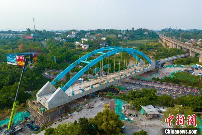 中新网成都9月25日电(记者 王鹏)25日上午,随着跨长95米、重约5300吨的哑铃型钢管混凝土简支拱落梁成功,隆黄铁路隆昌至叙永段扩能改造工程(下称隆黄铁路隆叙段)胡市镇特大桥主桥贯通。