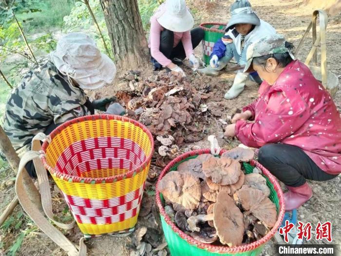 图为江西吉安市安福县羊狮慕镇书楼村林下仿野生灵芝种植示范基地内,农户正在采收灵芝。安福县委统战部供图