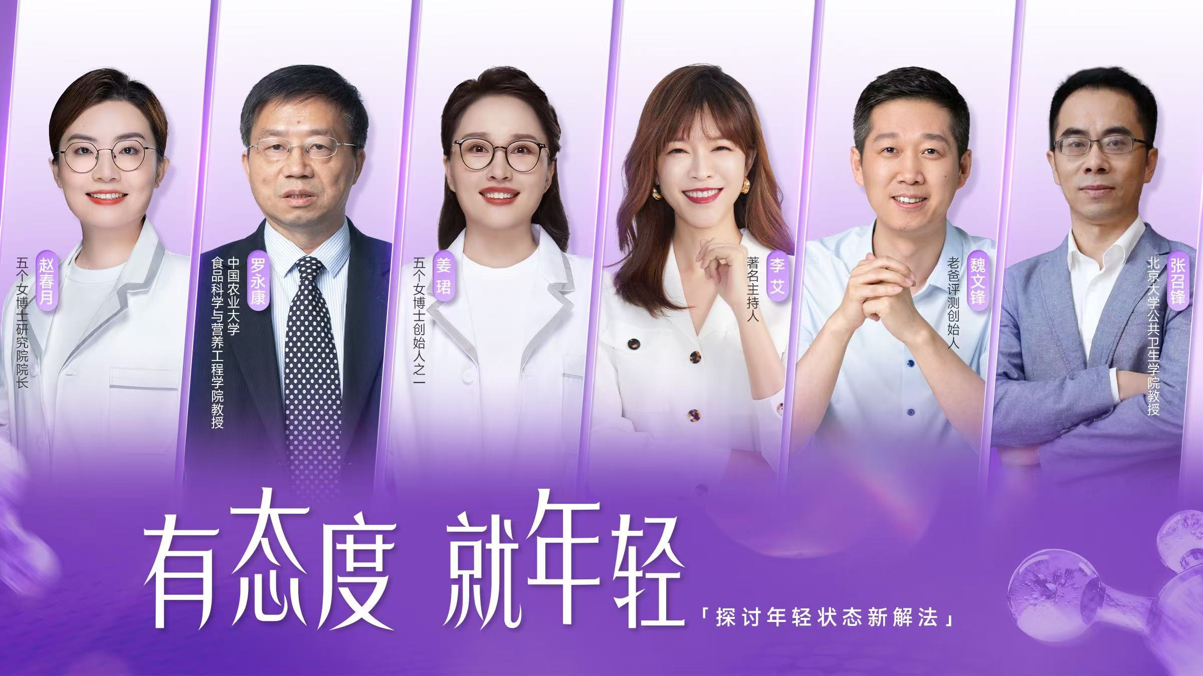 每个人砺砺一生,都在面临性别与年龄,生活与自己的锤问。在年龄悄然增长时,也许我们也会从心底对岁月的无情生起一丝敬畏,但事实上,衰老不等于衰败,年轻也并不只是粉颊红唇和体魄的矫健,它是一种心态,是对未知世界的好奇,勇于探索的行动,与不懈追求的创新精神。近日,五个女博士品牌发起了一场关于身心状态和生活方式的主题访谈。中国农业大学食品科学与营养工程学院教授罗永康、北京大学公共卫生学院教授张召锋、老爸评测创始人魏文锋、五个女博士联合创始人之一姜珺、五个女博士研究院院长赵春月,五位来自不同领域的佼佼者,与主持人李艾一起围绕“有态度 就年轻”的主题,为观众带来了一场精彩对话。
