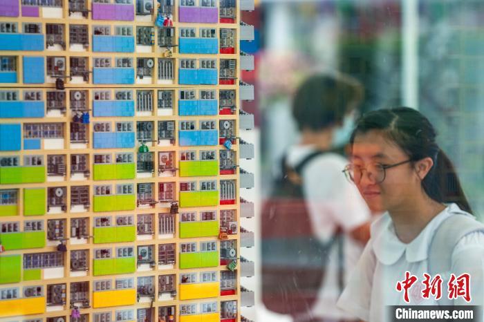 图为学生观看由乐高积木搭建的“彩虹邨”公共住宅模型。中新网记者 侯宇 摄