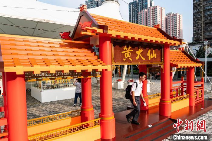 图为一名学生穿行一部分由乐高积木搭建而成的仿黄大仙祠门庭模型。中新网记者 侯宇 摄