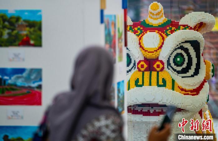 图为由乐高模型搭建的一尊“舞狮”模型吸引市民观看。中新网记者 侯宇 摄
