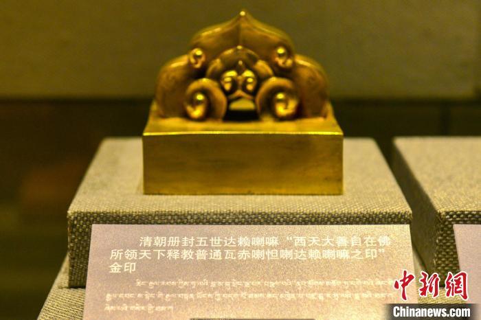2019年3月28日,在西藏百万农奴解放纪念馆展出的清朝册封五世达赖喇嘛金印。 中新社记者 江飞波 摄