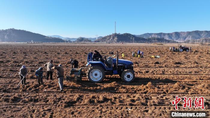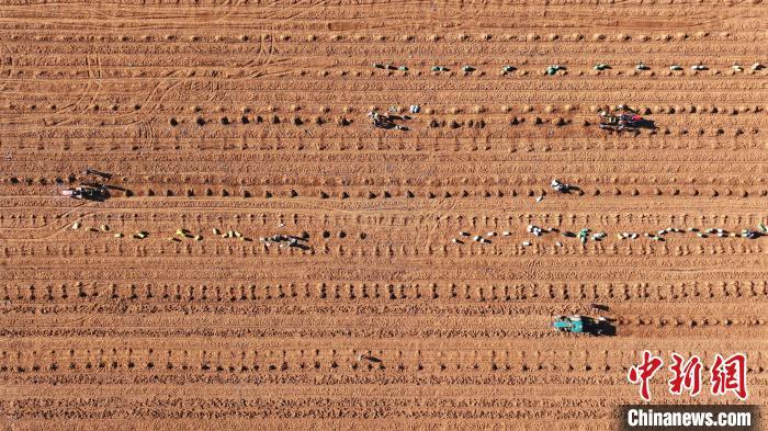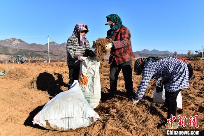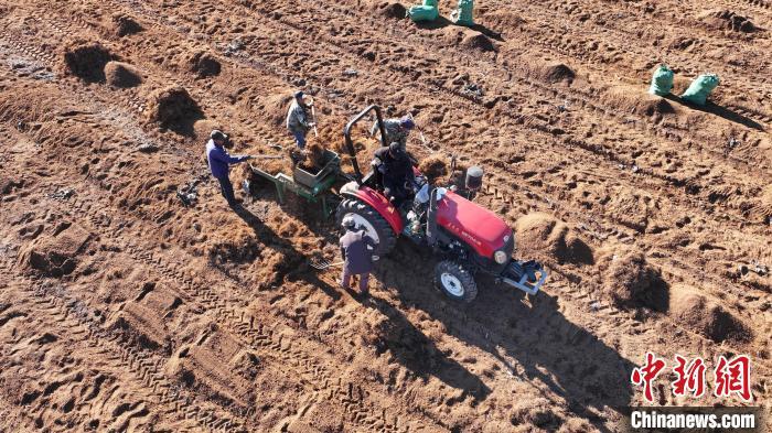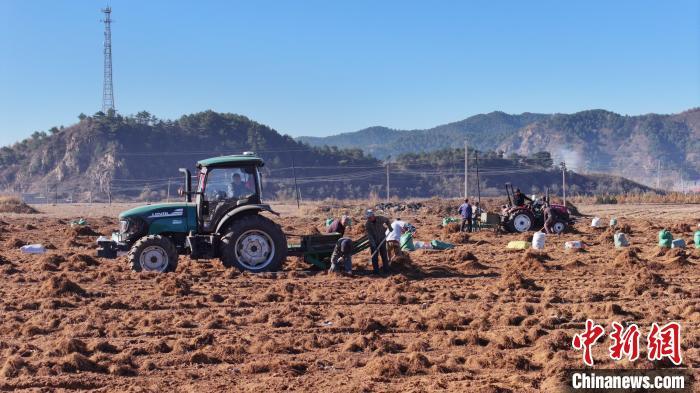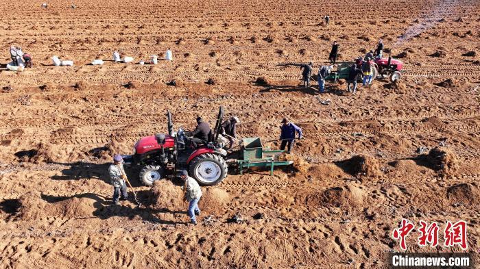 10月28日,河北省秦皇岛市青龙满族自治县龙王庙镇中药材种植基地的北苍术喜获丰收,农机在药田里穿梭,一个个“小土球”破土而出,药农忙着采收、挑拣、装袋、运输。青龙满族自治县位于燕山深处,近年来当地通过建设基地、科技研发、企业带动、品牌打造的方式不断推动中药材产业发展壮大,目前当地中药材种植面积11.5万亩,产值达5.6亿元,带动4万多名农户增收致富。图为航拍龙王庙镇中药材种植基地。(无人机图片)沈猛 摄